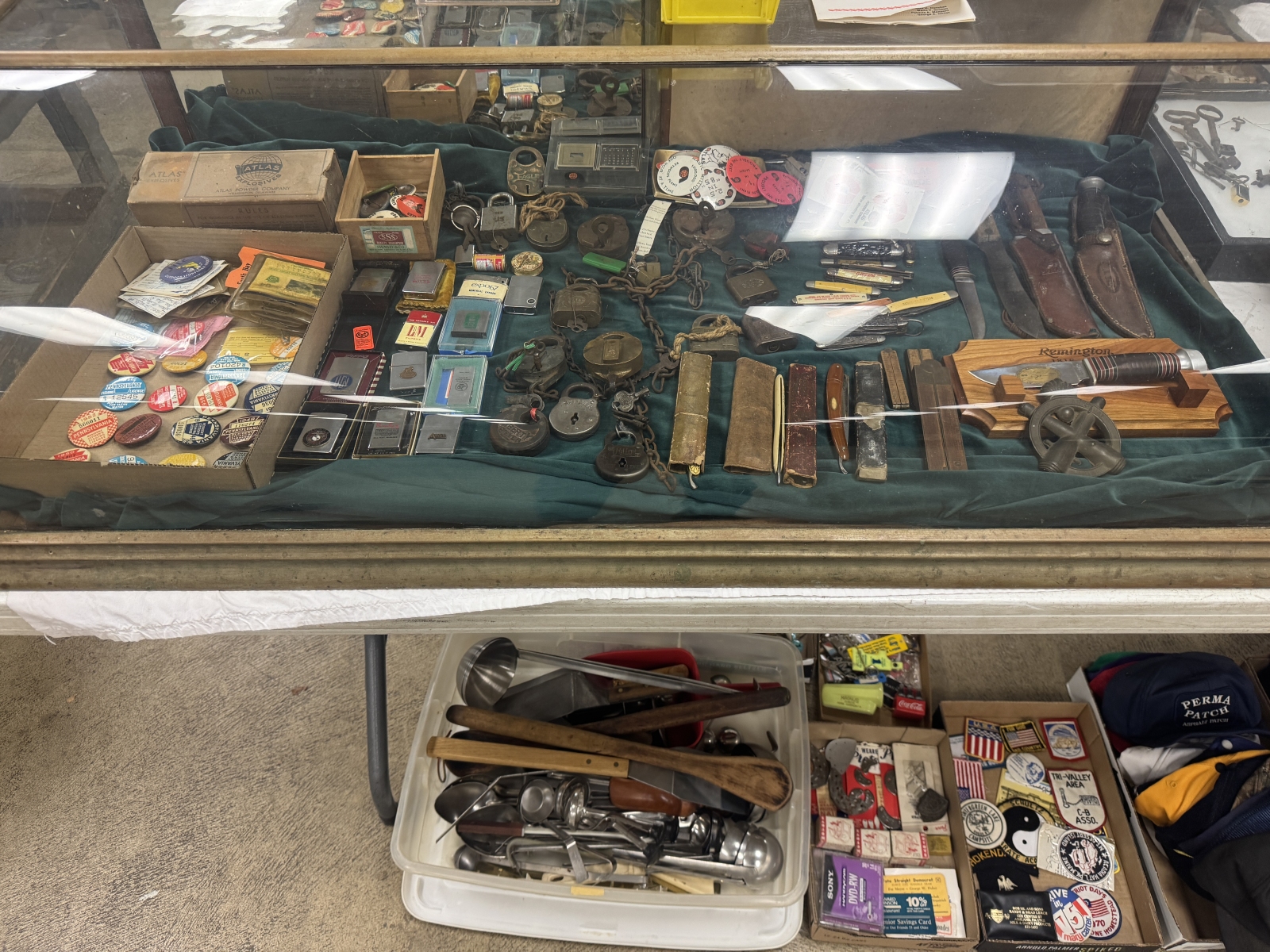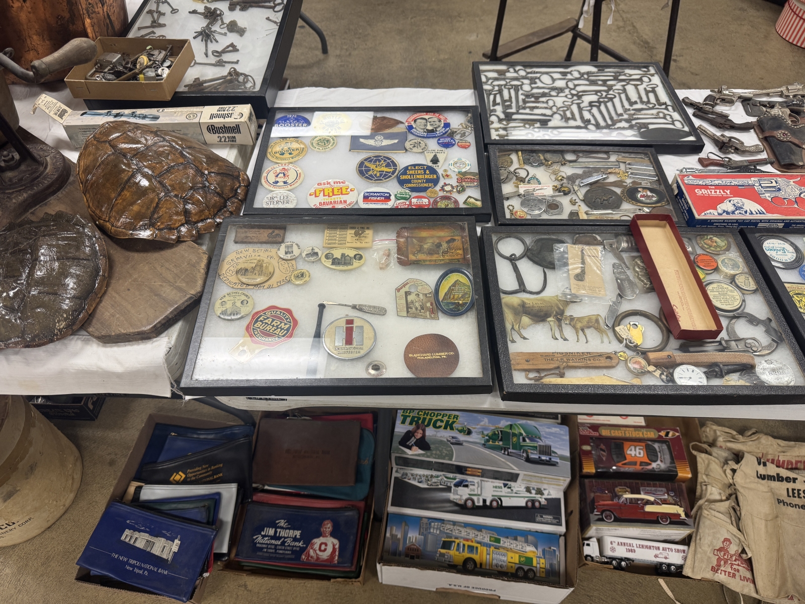 PRIMITVES/COLLECTABLES: PA Game Commission Patch Collection (1982 to 2003), Knives (KaBar, Remington, Pocket), Carpenter Aprons, Bank Bags, Skeleton Keys, RR Locks & Keys, Trappers Basket w/License, Corn Huskers, Cap Guns, Zippo Lighters, Local Pins, Local Fire Badges, Antique Transits, Carpenter Pencils, Turtle Shells, Lehigh Navigation Coal Company Employee Badges