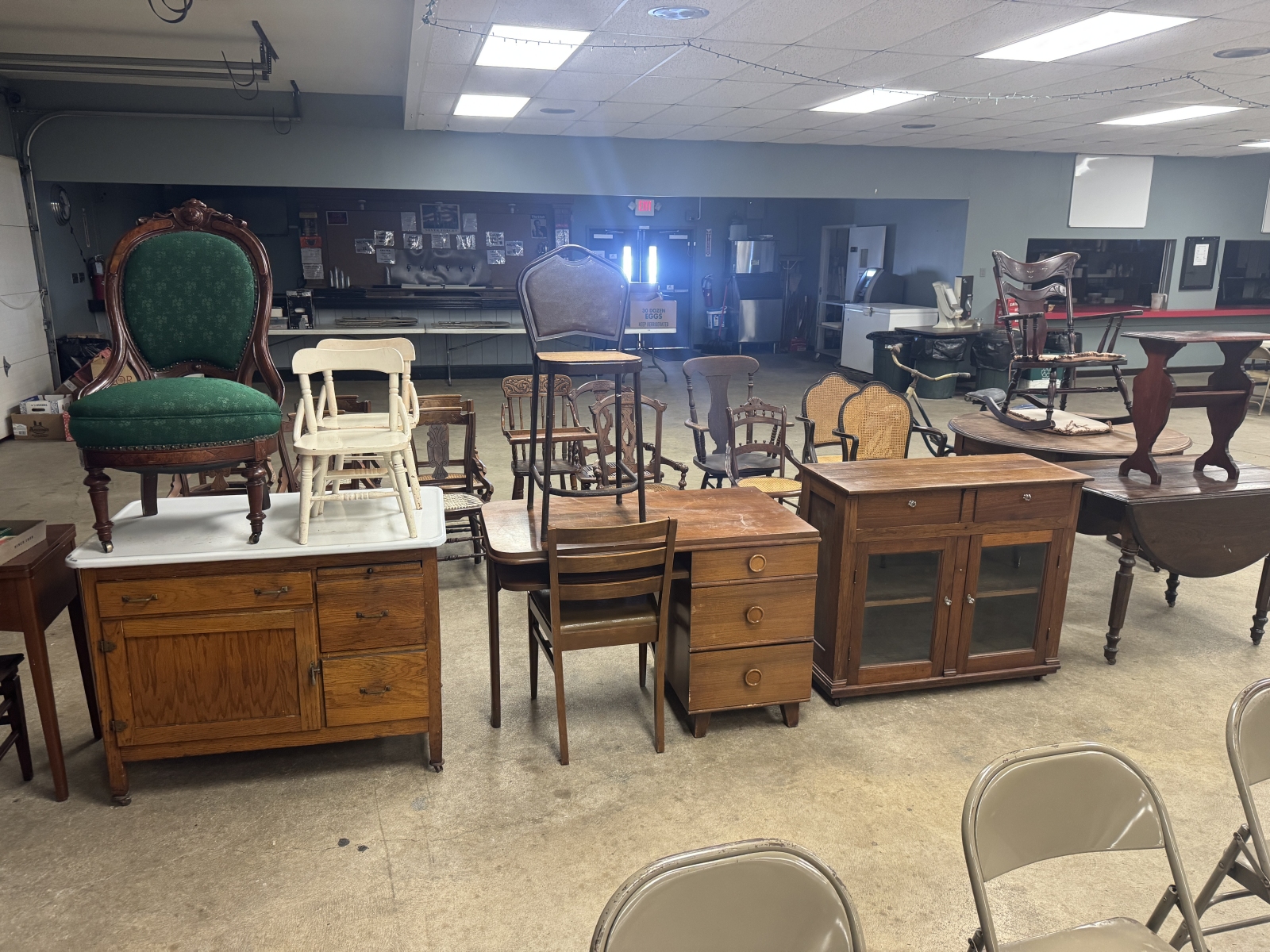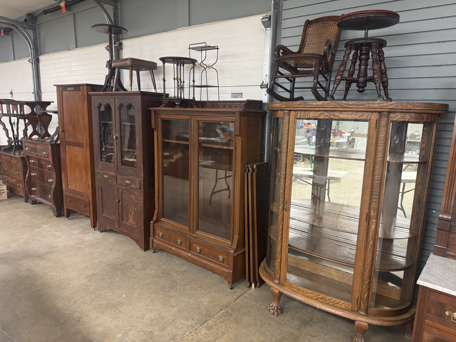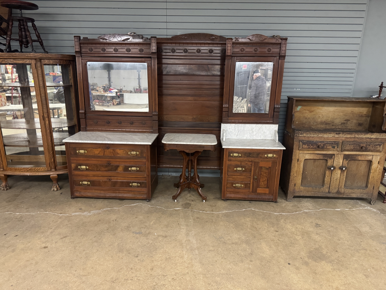 FURNITURE: Bow Front China Closet, Walnut Double Door Bookcase, Hoosier Cabinet Base, Drop Leaf Table, Marble Top Tables, Marble Top Washstand, Marble Top Bedroom Suite, Claw Foot Piano Stool, Empire Style Chests, Dressers w/Mirrors, Wardrobe Cabinet, Chairs